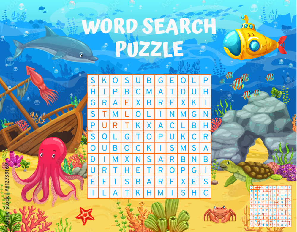Cartoon sea underwater animals and landscape Word search puzzle game