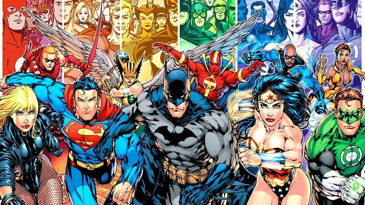 A group of superheroes in dynamic poses against a blue background