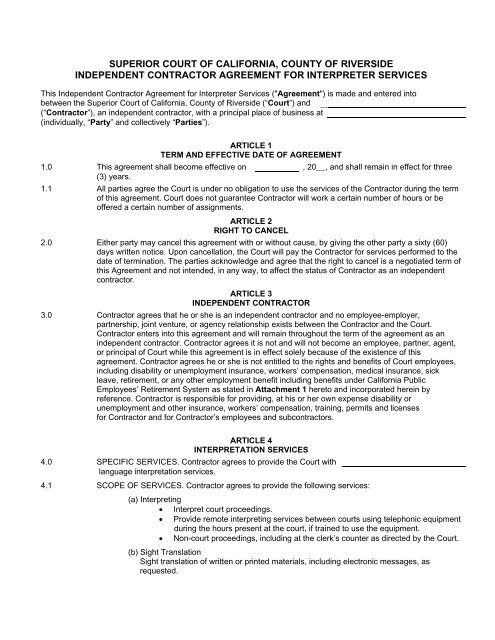 Independent Contractors Agreement Superior Court Riverside