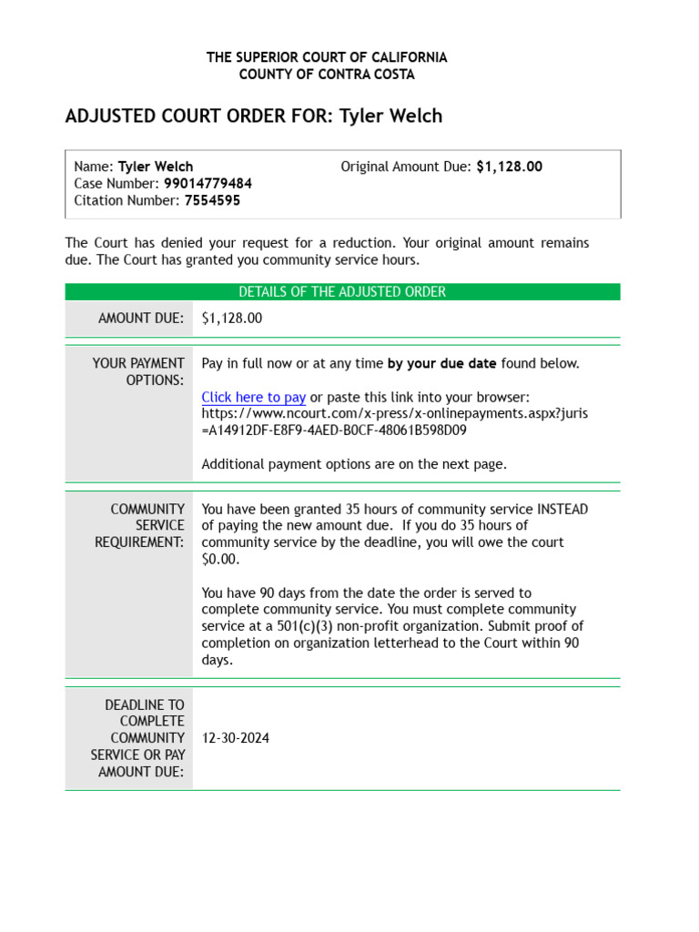 Adjusted Court Order For: Tyler Welch: The Superior Court of California