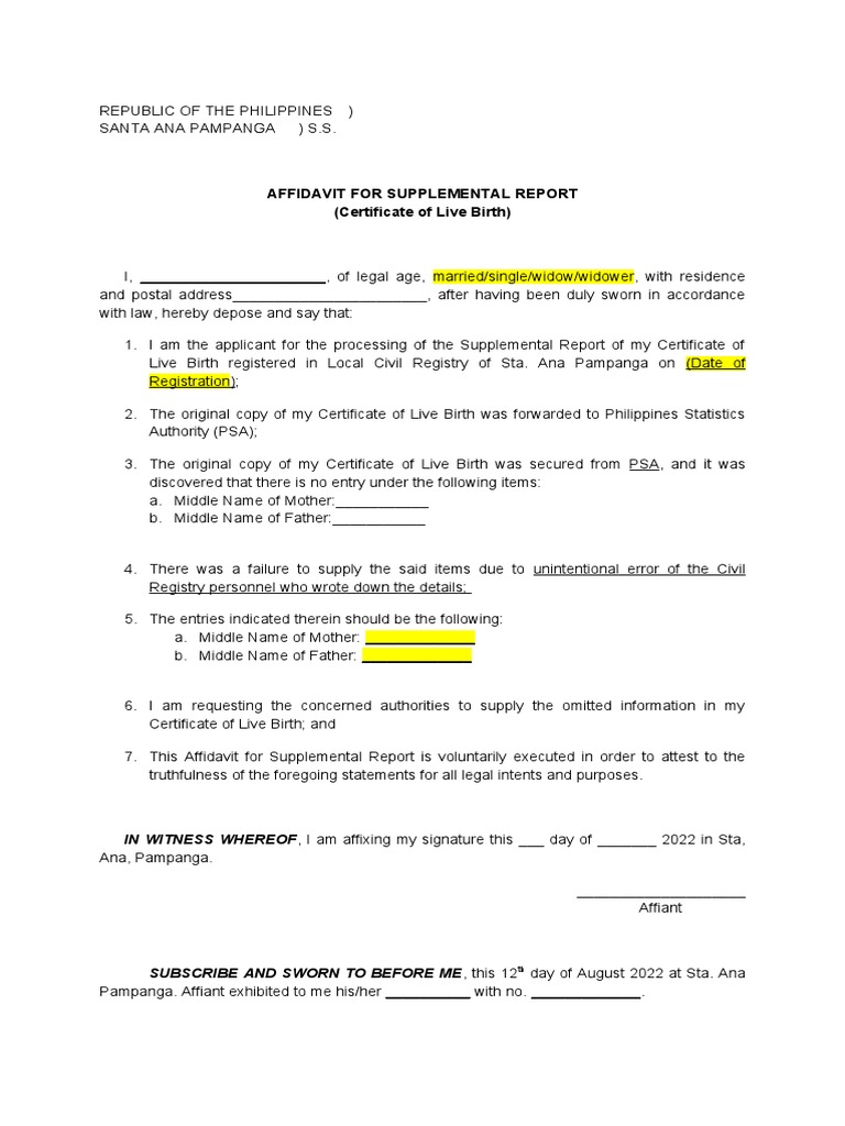 Affidavit For Supplemental Report PDF Affidavit Birth Certificate