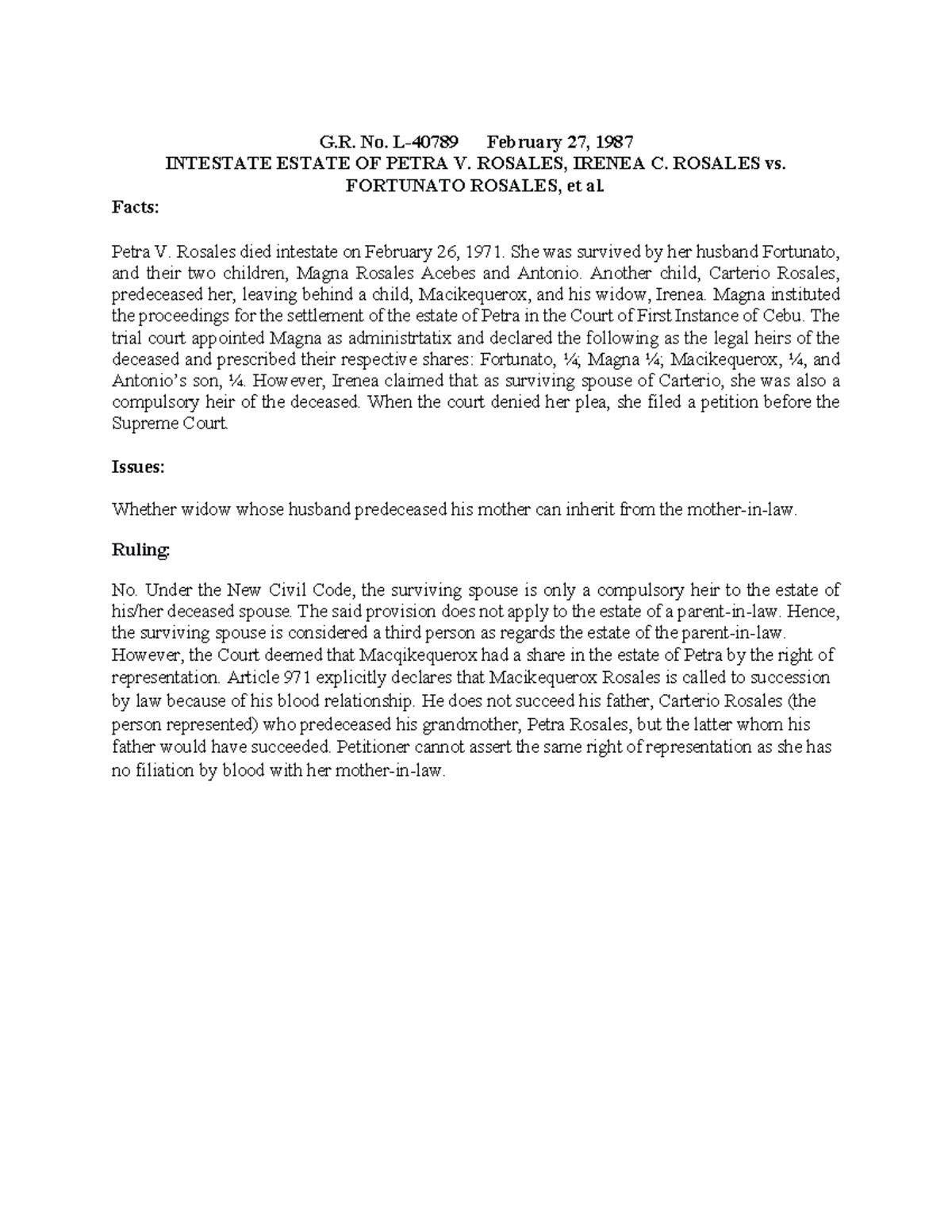 Supreme Court Case Study: Rosales vs Rosales G R No L 40789 Studocu