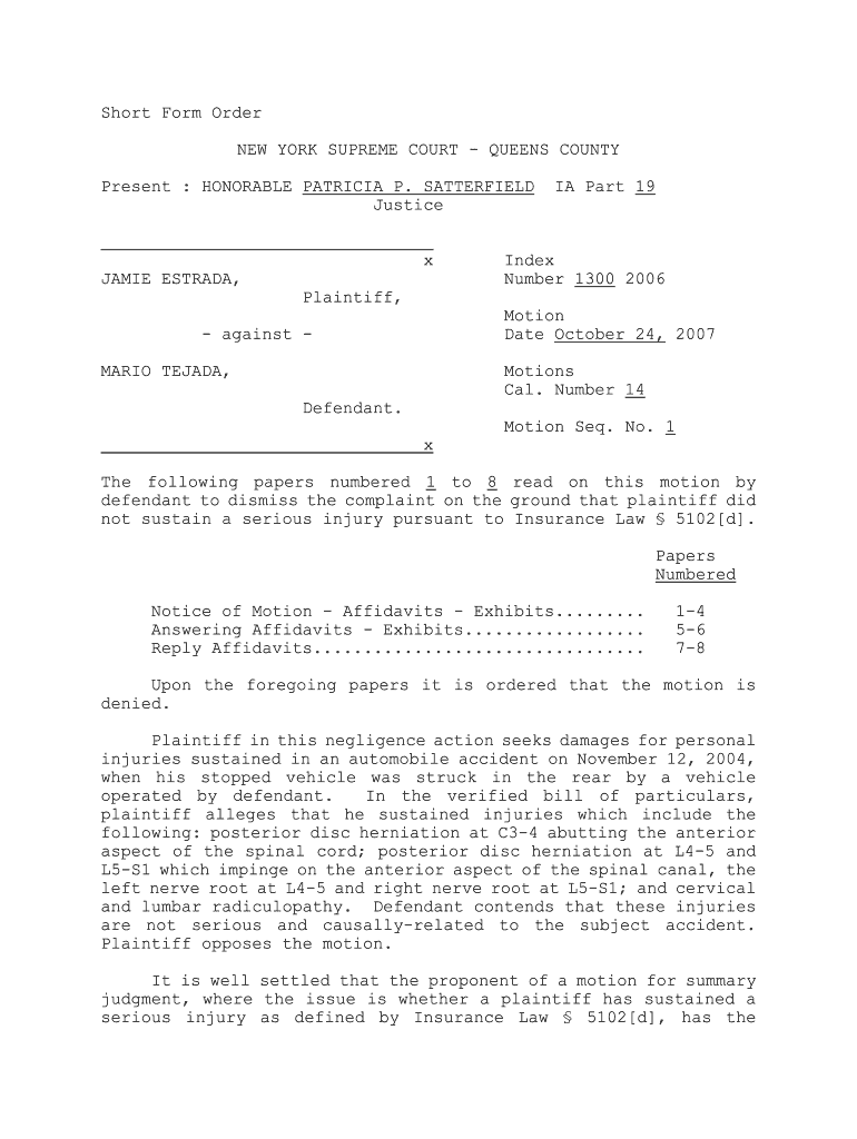 Short Form Order NEW YORK SUPREME COURT QUEENS COUNTY Present