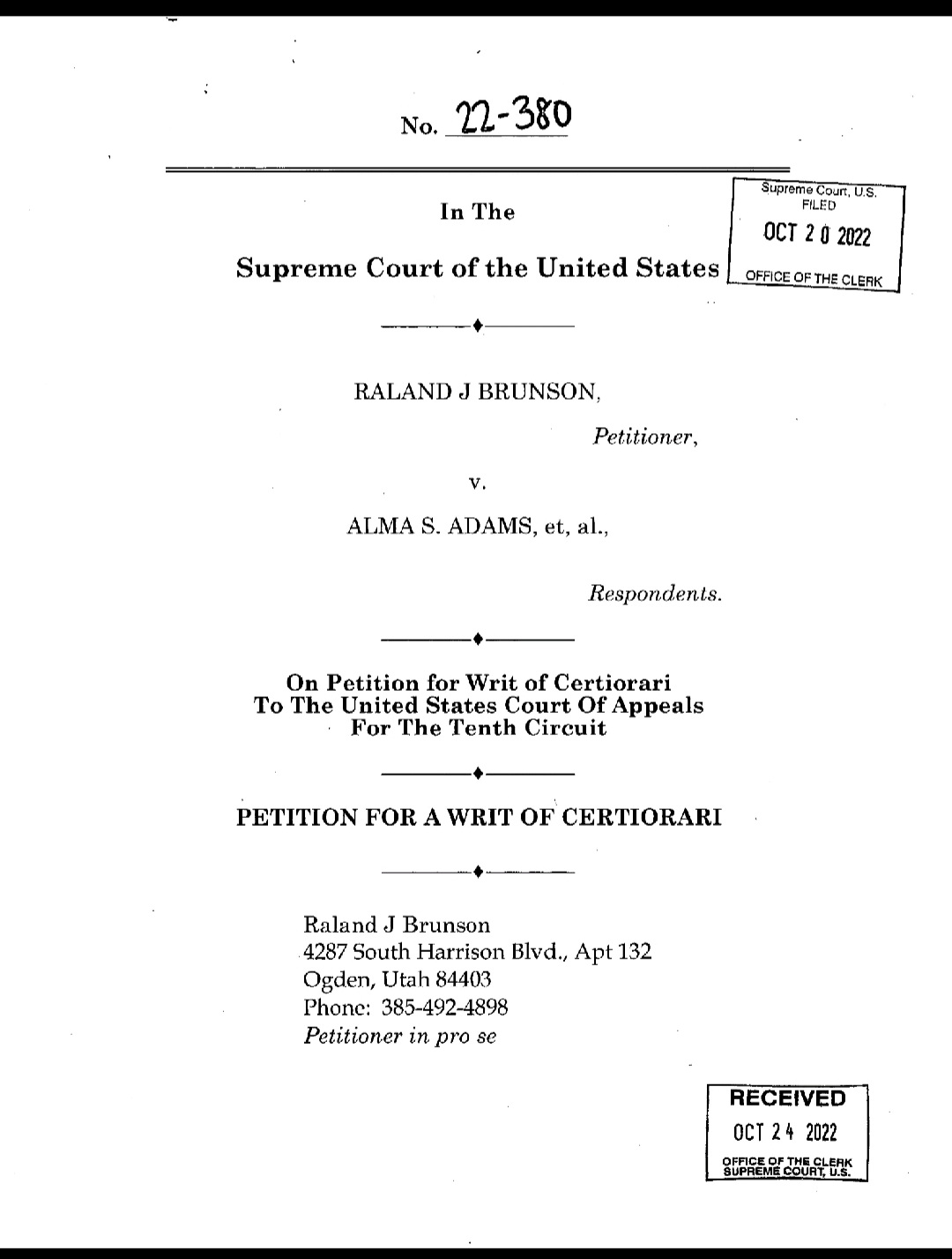Supreme Court Case #22 380 Brunson VS Adams Defendants Joseph Biden
