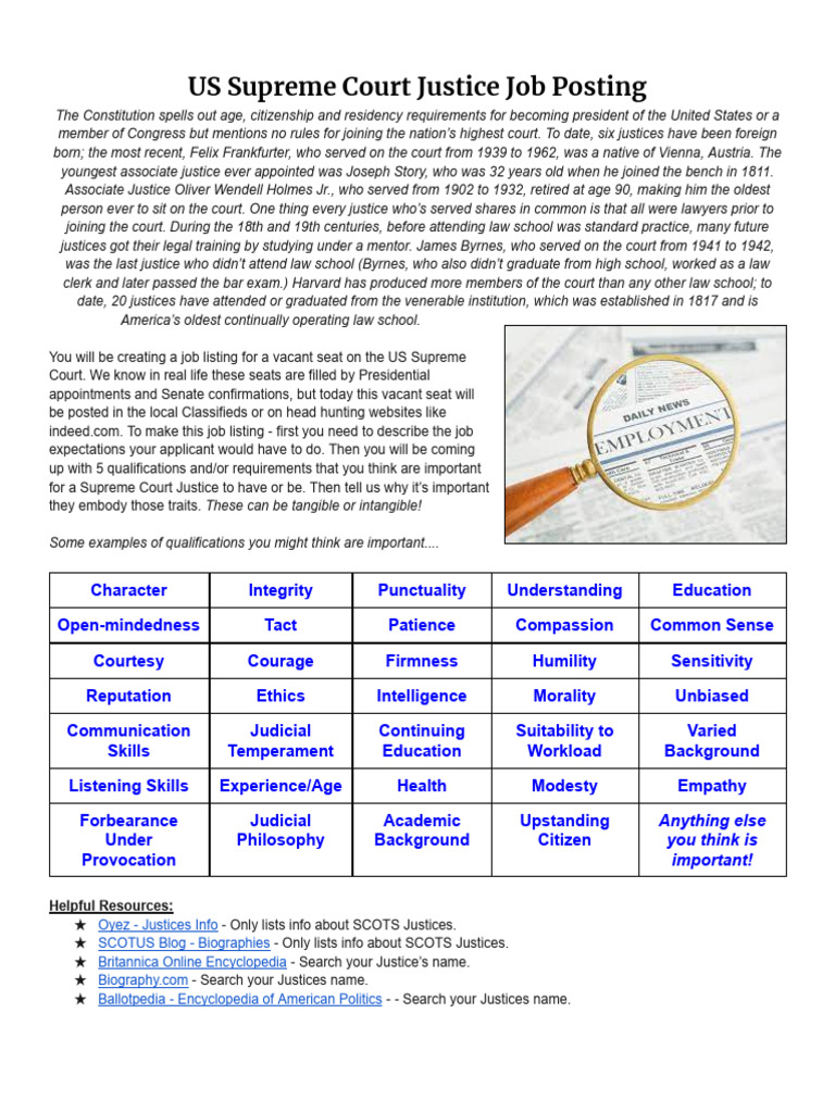 Supreme Court Justice Job Posting Project by Mrs Ds Social Studies Store