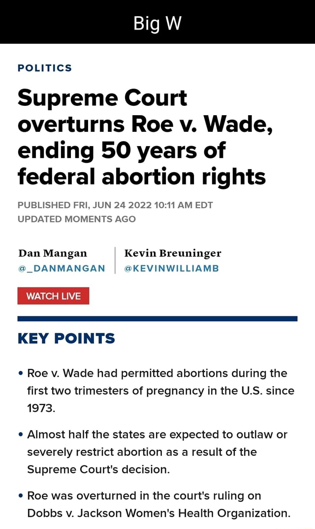 Big W POLITICS Supreme Court overturns Roe v Wade ending 50 years of