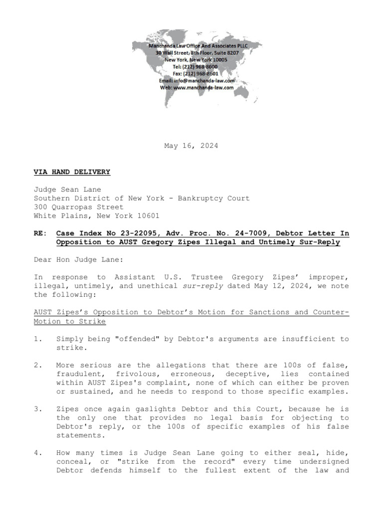 Debtor Letter in Opposition To AUST Gregory Zipes Illegal and Untimely
