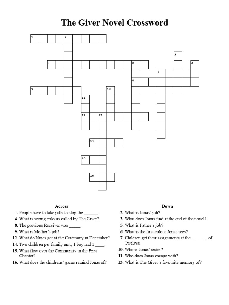 THE GIVER Novel Study Crossword Puzzle All about THE GIVER CrossWord