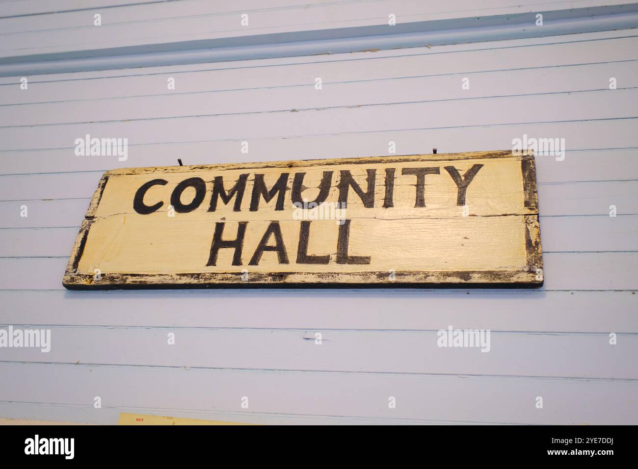 Display of a typical old wood sign for the Community Hall At the