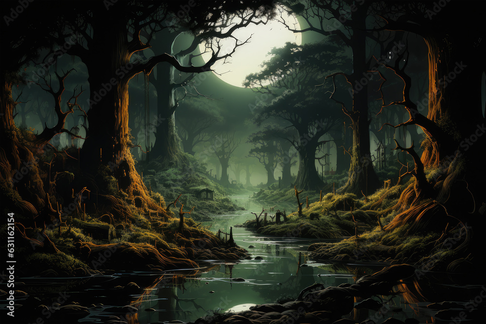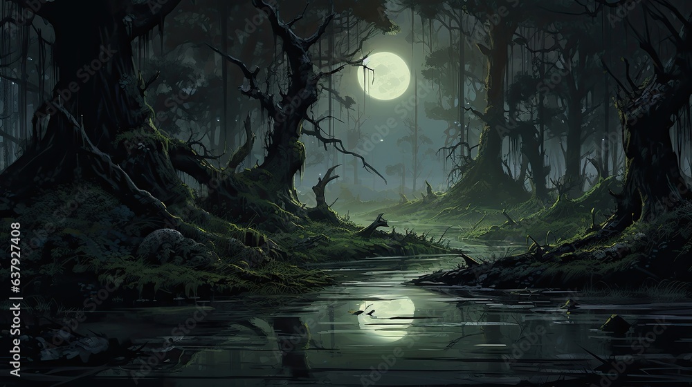 Premium Photo There is a painting of a swamp in the woods at night AI