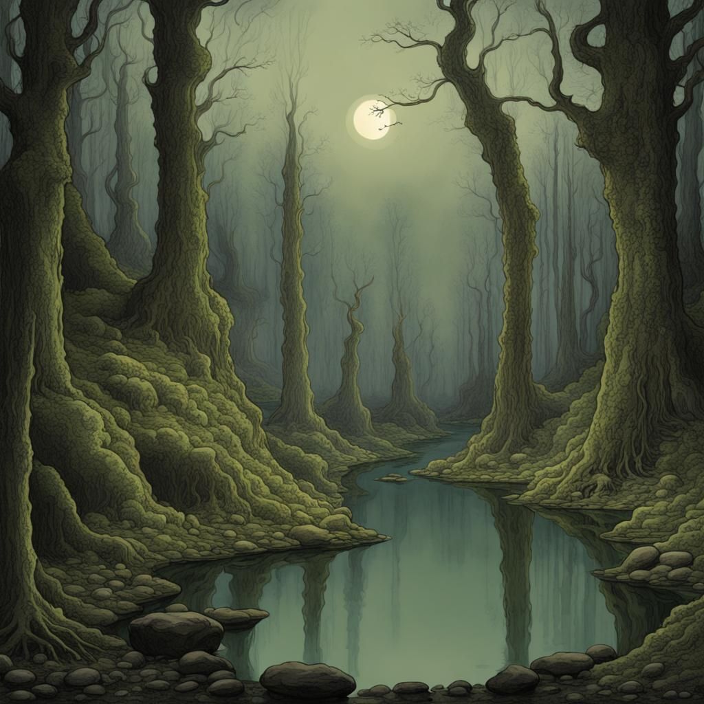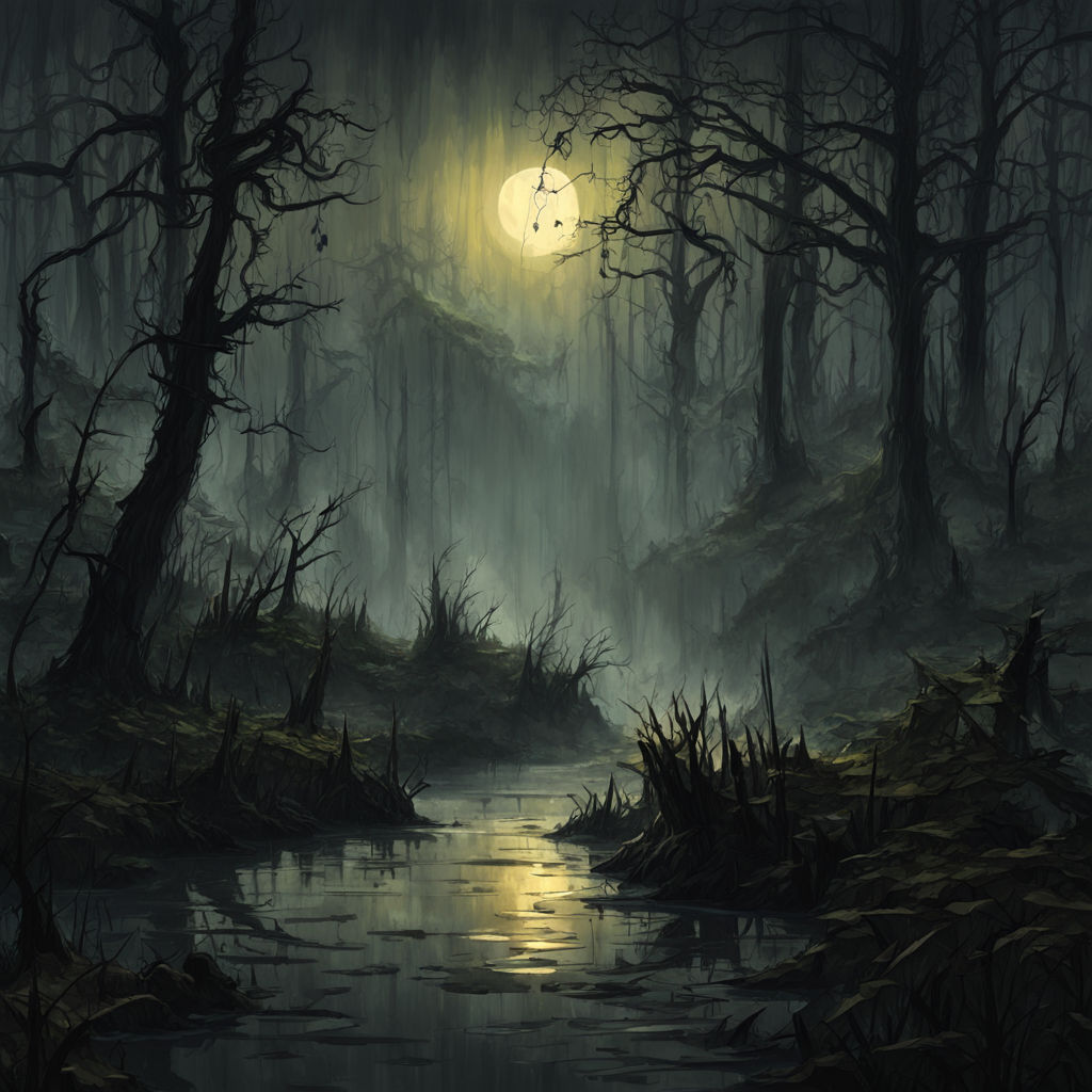 Dark fantasy night rainy foggy swamp by Лев Сайков Playground