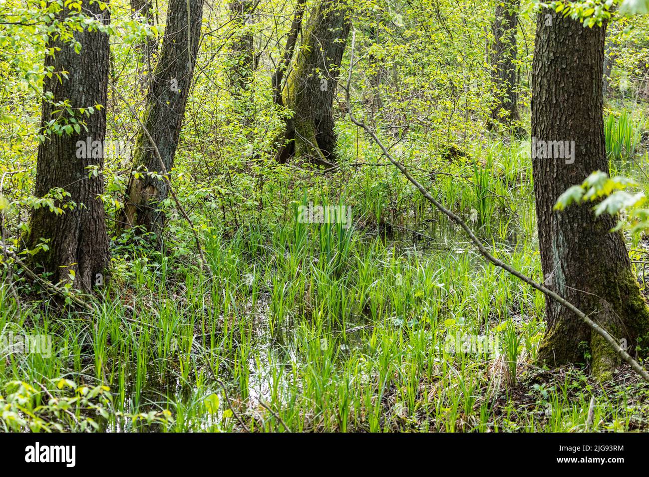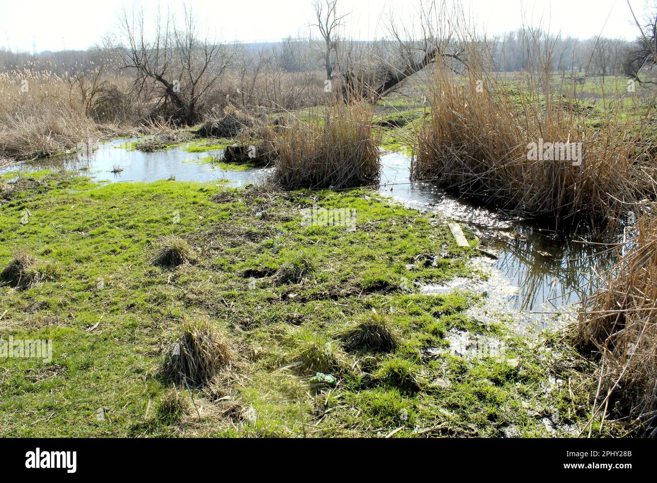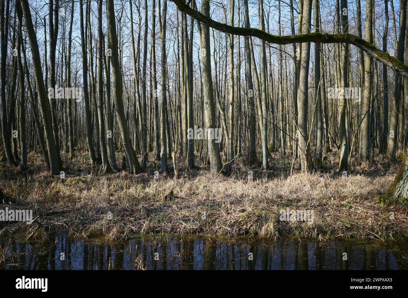 Swamp surrounded by forest Swampy land and wetland marsh bog Stock
