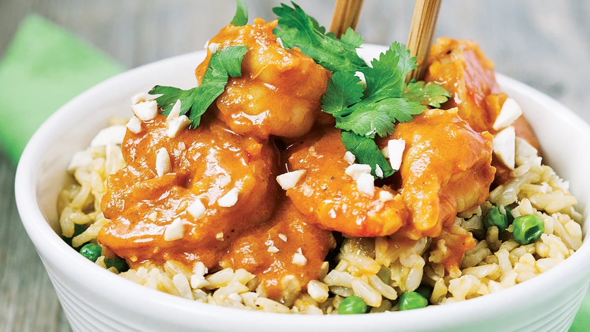 Shrimp Coconut Curry with Green Pea Pilaf