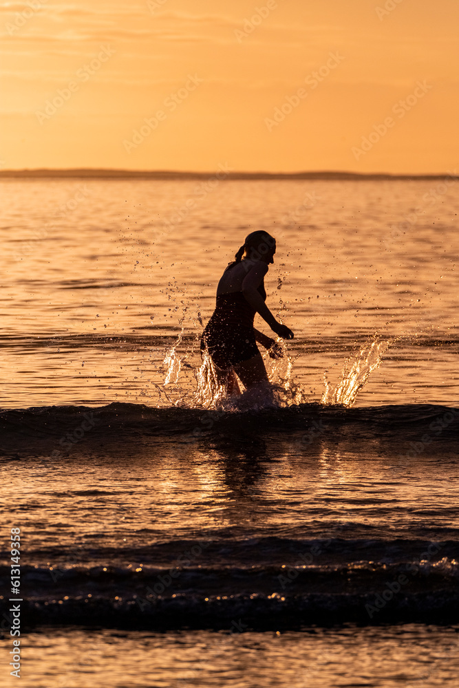 Silhouette of female swimmer having a splash in the Atlantic ocean in