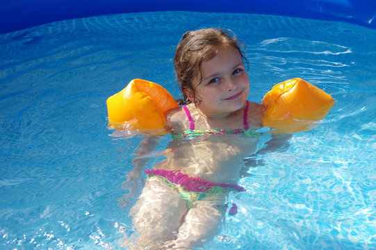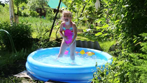 Young Girl Swimming in Inflatable Pool in Summer Children and Water
