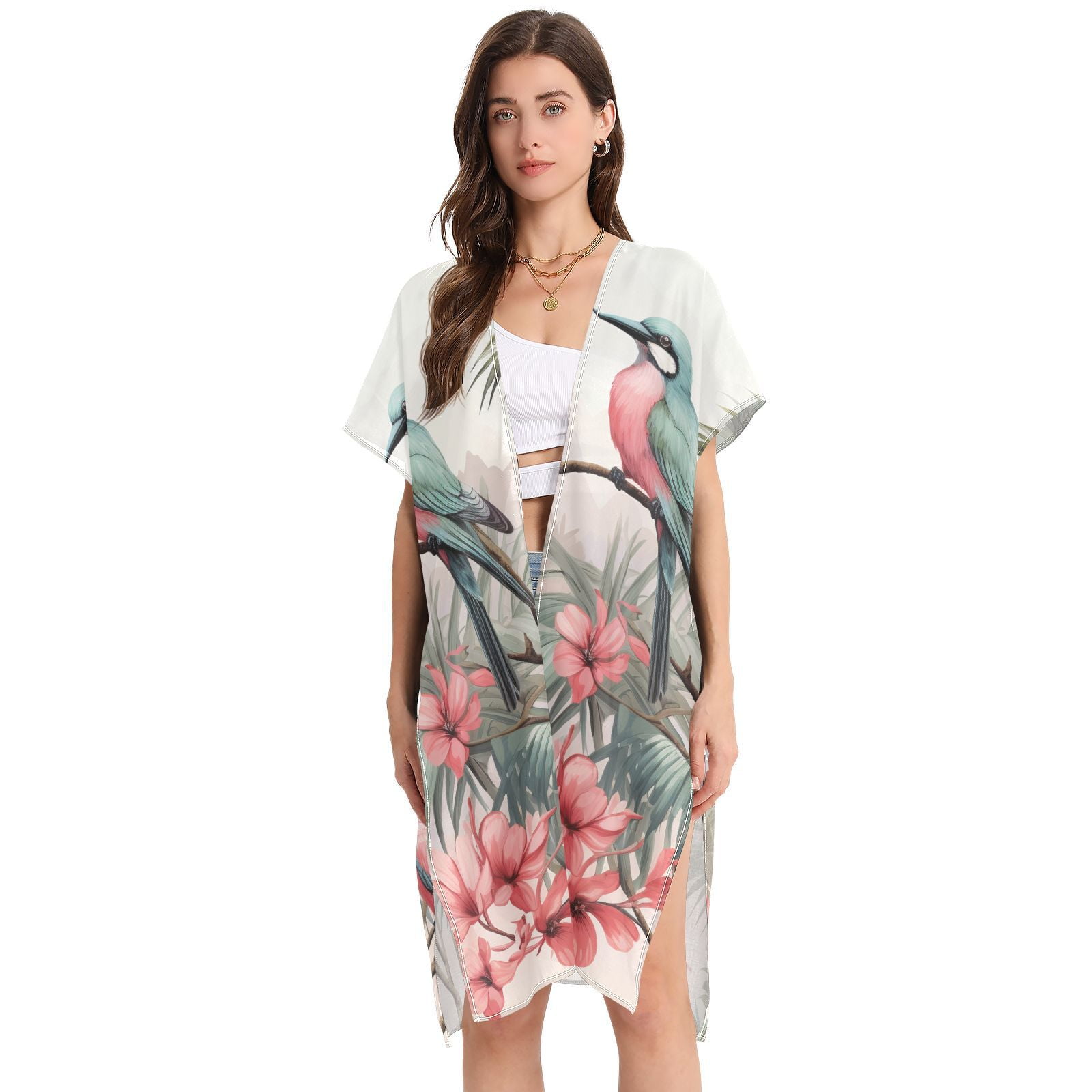 Birds Flowers and Leaves Women Swimsuit Cover up V Neck Beach Dress