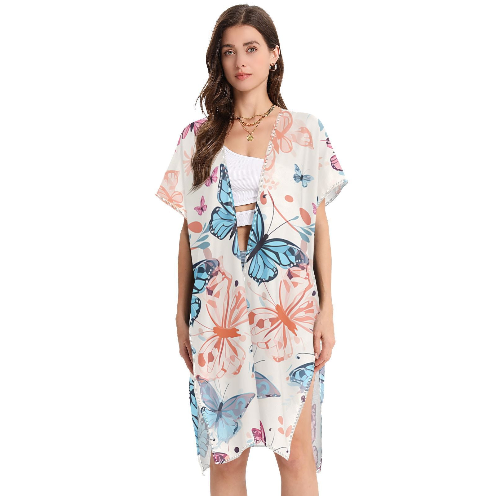 Butterflies Blue Pink Women Swimsuit Cover up V Neck Beach Dress Short