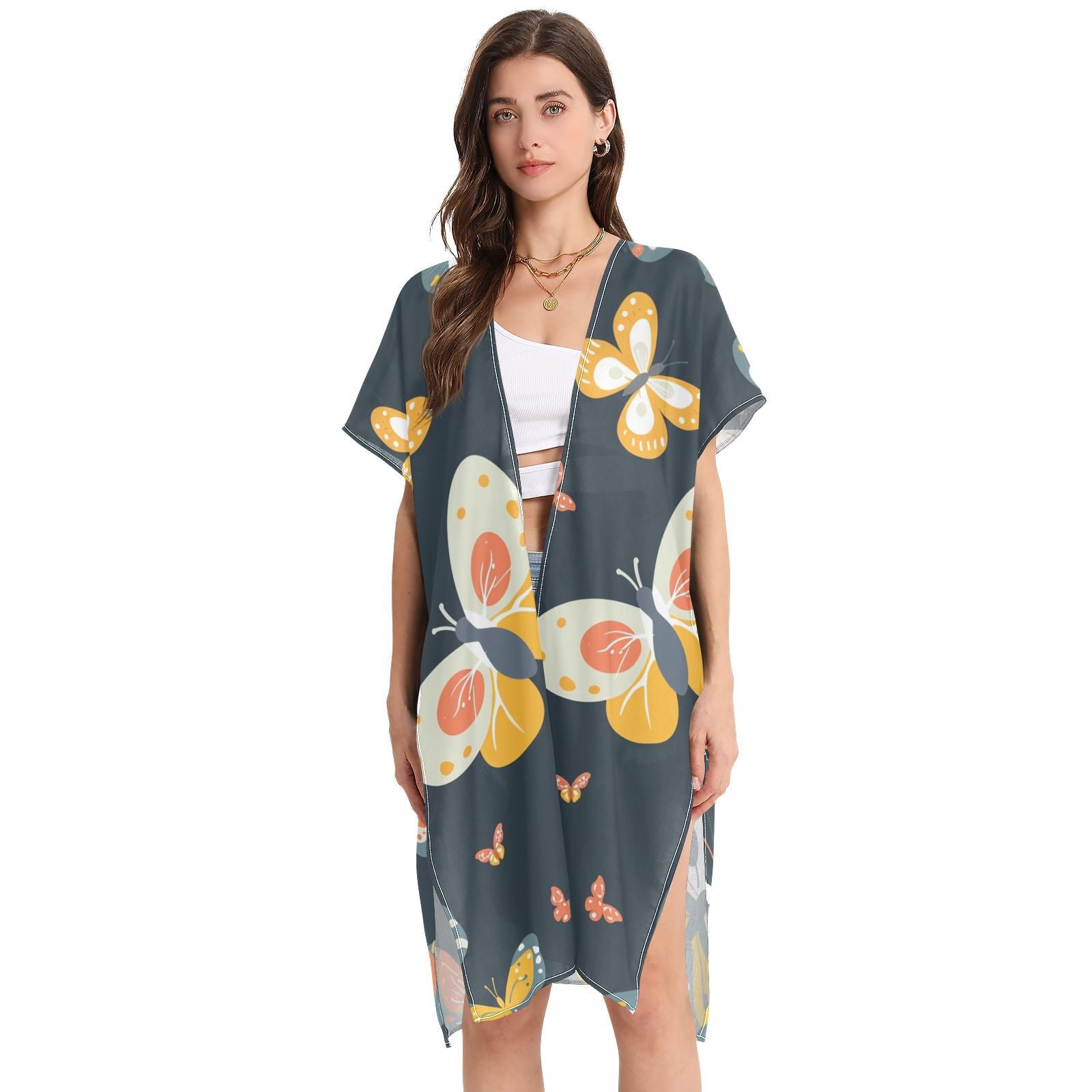 Butterflies Orange Women Swimsuit Cover up V Neck Beach Dress Short