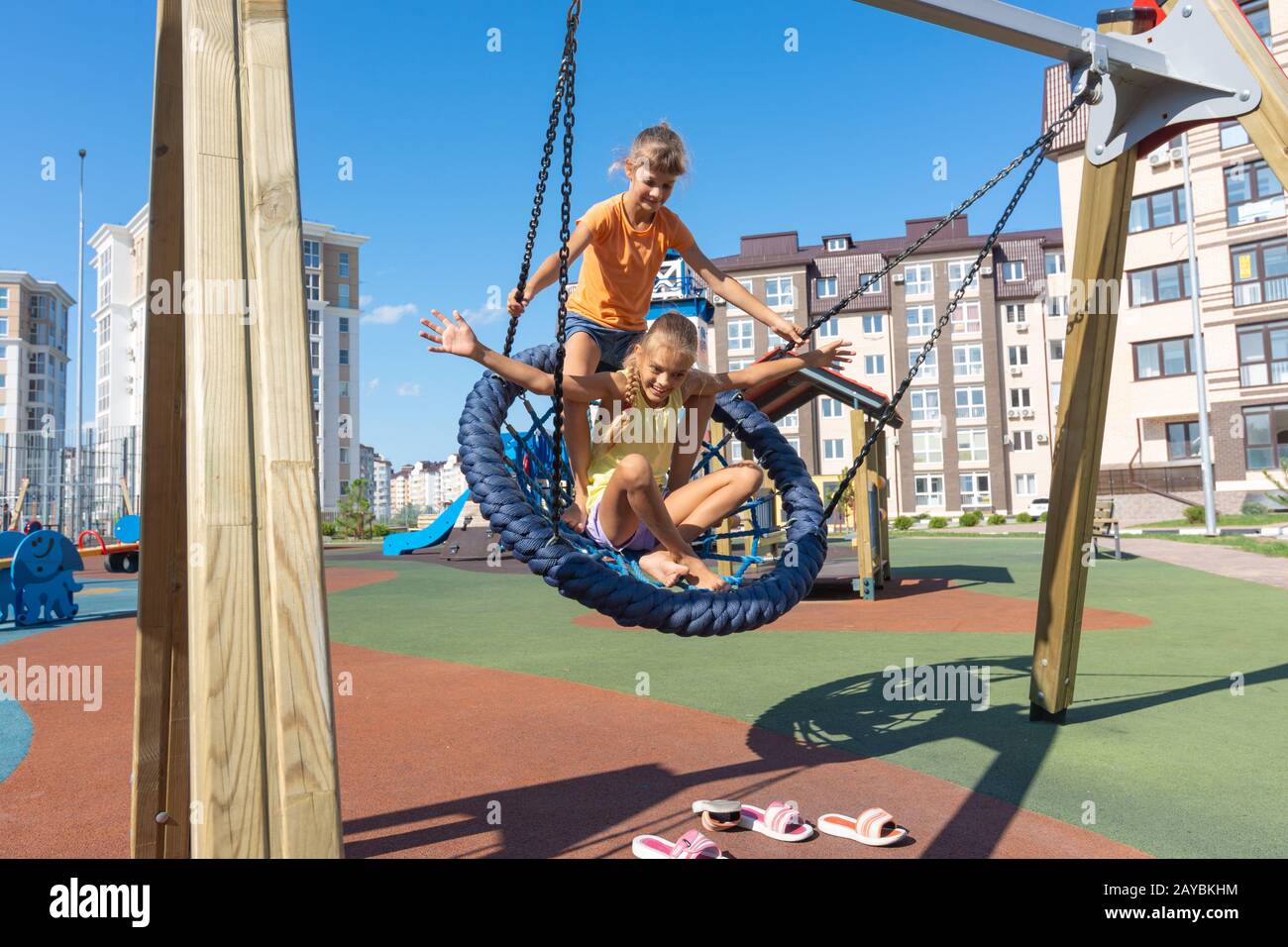 Two Happy Little Girls Swinging on the Swing Stock Photo Image of
