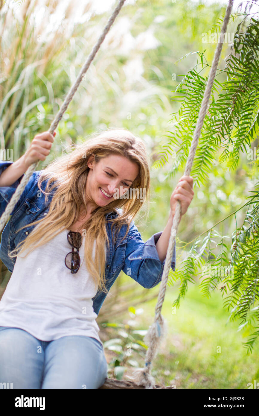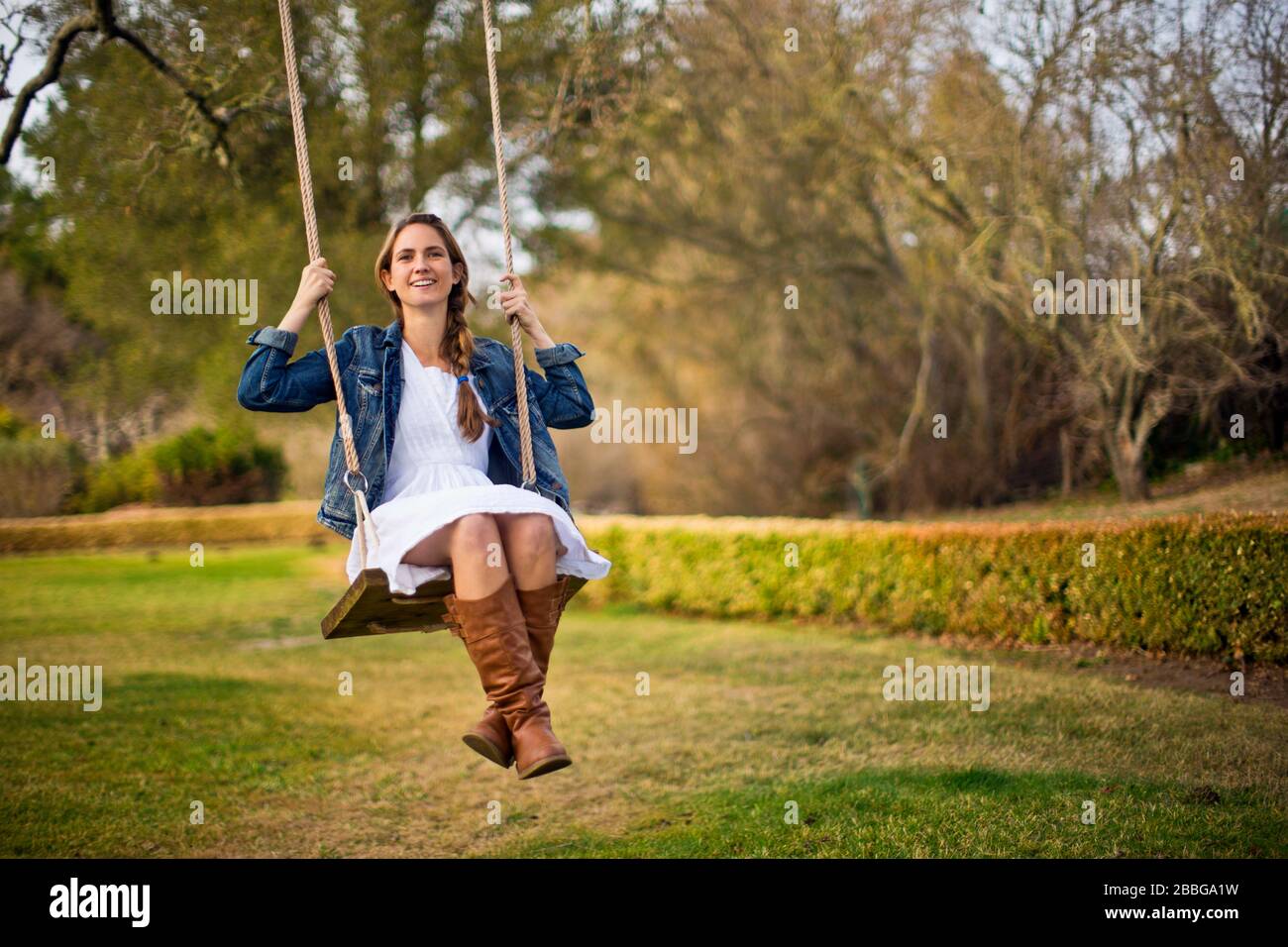 Outdoor Portrait of a Smiling Happy Girl Sensual Woman Swinging on