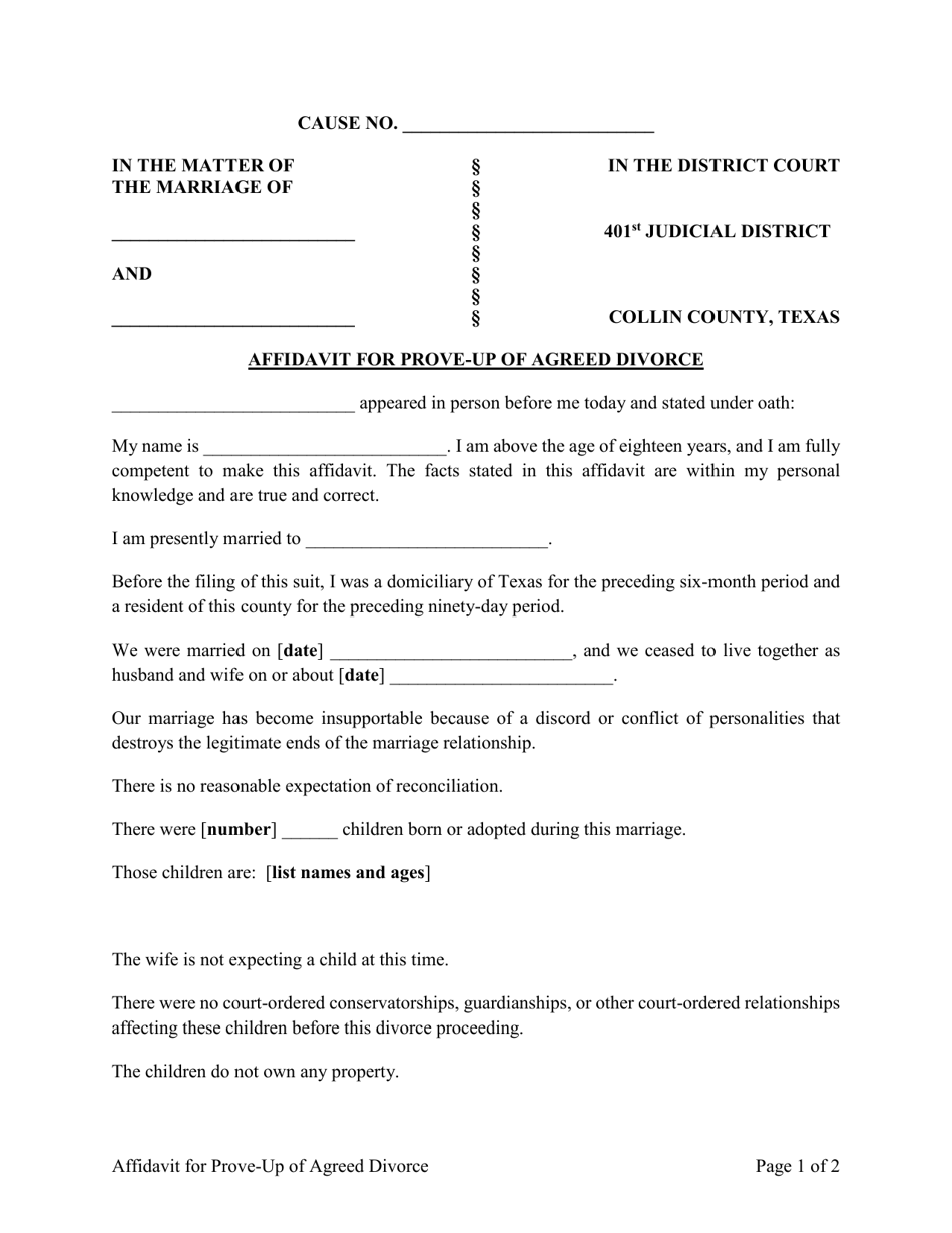 Collin County Texas Affidavit for Prove Up of Agreed Divorce 401th
