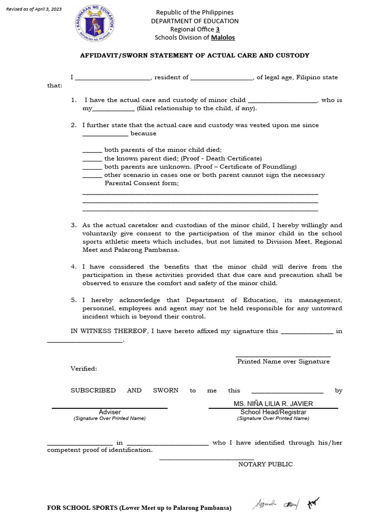9 Sworn Statement of Actual Care and Custody Revised PDF Civil Law