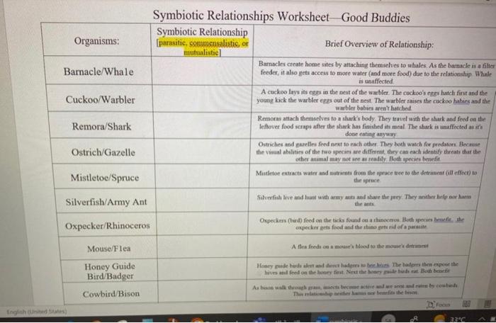 Symbiotic Relationships Worksheet Answer Key