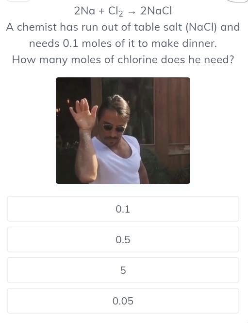 Solved: 2Na Cl 2to 2NaCl A chemist has run out of table salt (NaCl) and