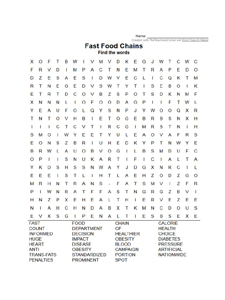 Free Printable Fast Food Crossword Puzzle