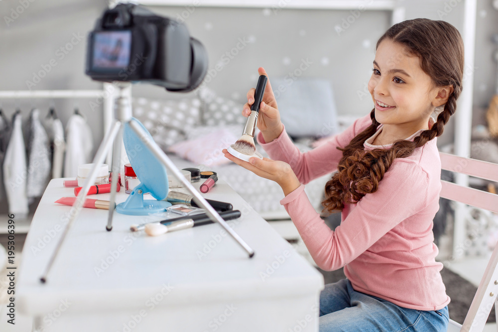 Sharing ideas Pleasant cheerful pre teen girl sitting near her drawer