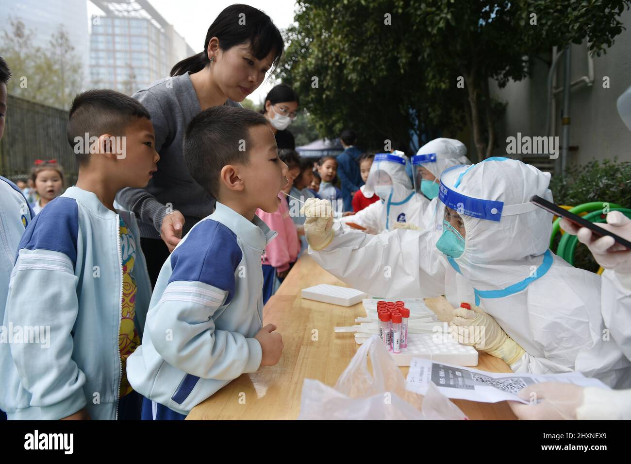 NANJING CHINA MARCH 14 2022 A medical worker takes throat swab