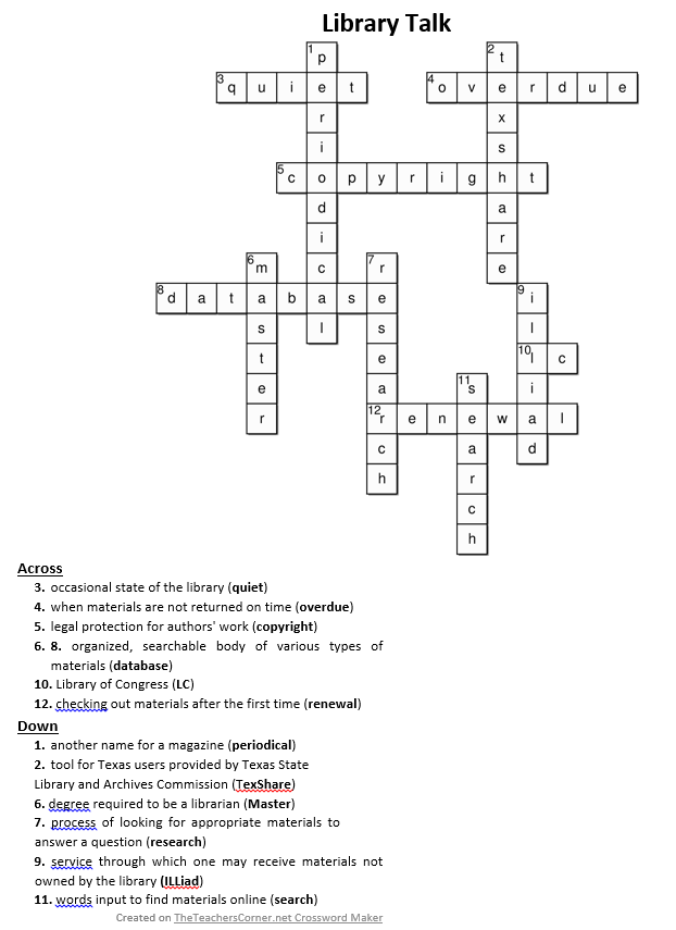 Library Online Lounge Tarleton Libraries: Library Talk Crossword