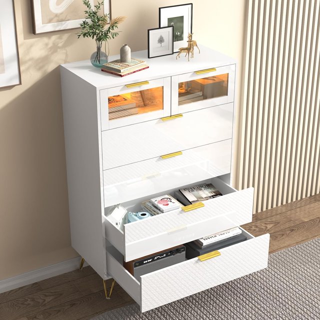 ChVans White 6 Drawer Dresser with LED Lights Modern Tall Chests of