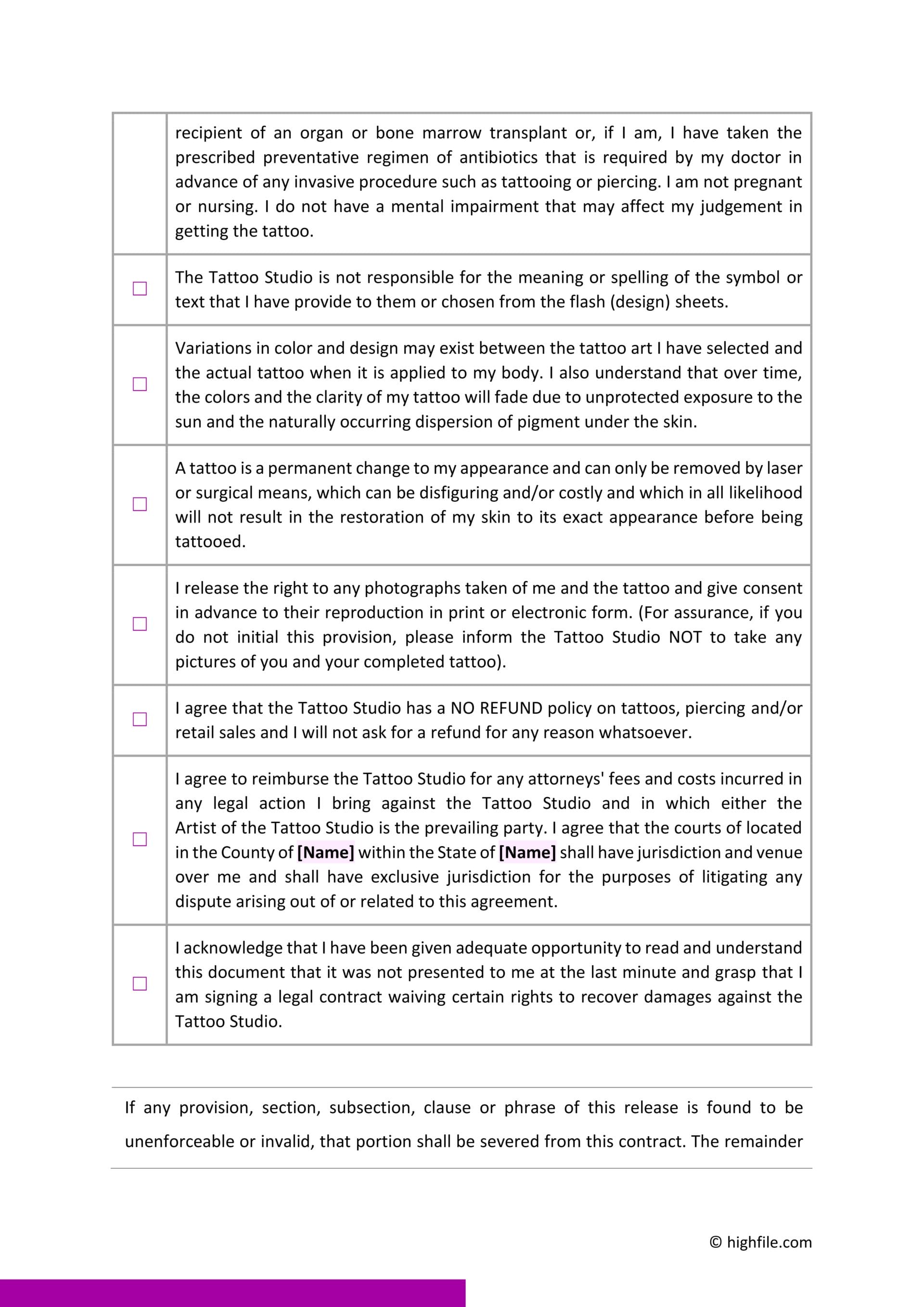 Tattoo Consent Waiver Forms
