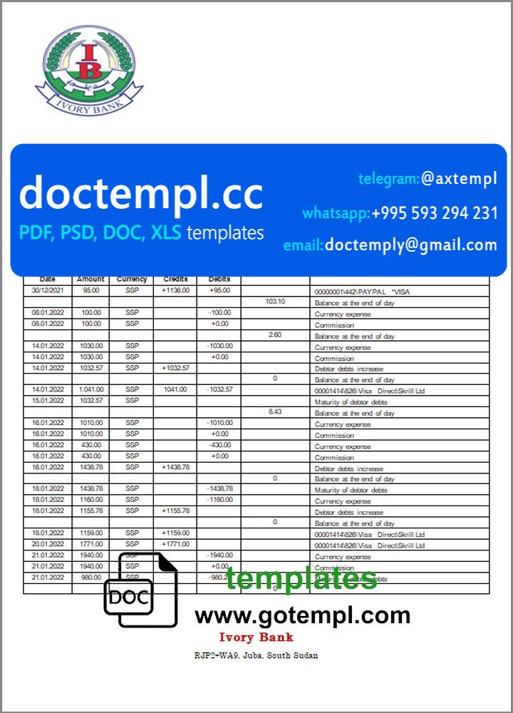 South Sudan Ivory Bank bank statement template in Word and PDF format