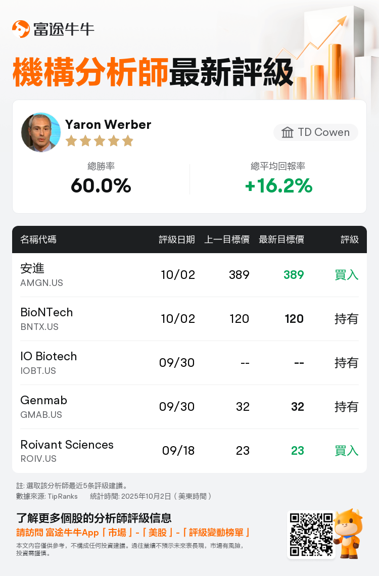 TD Cowen維持安進(AMGN US)買入評級,維持目標價389美元