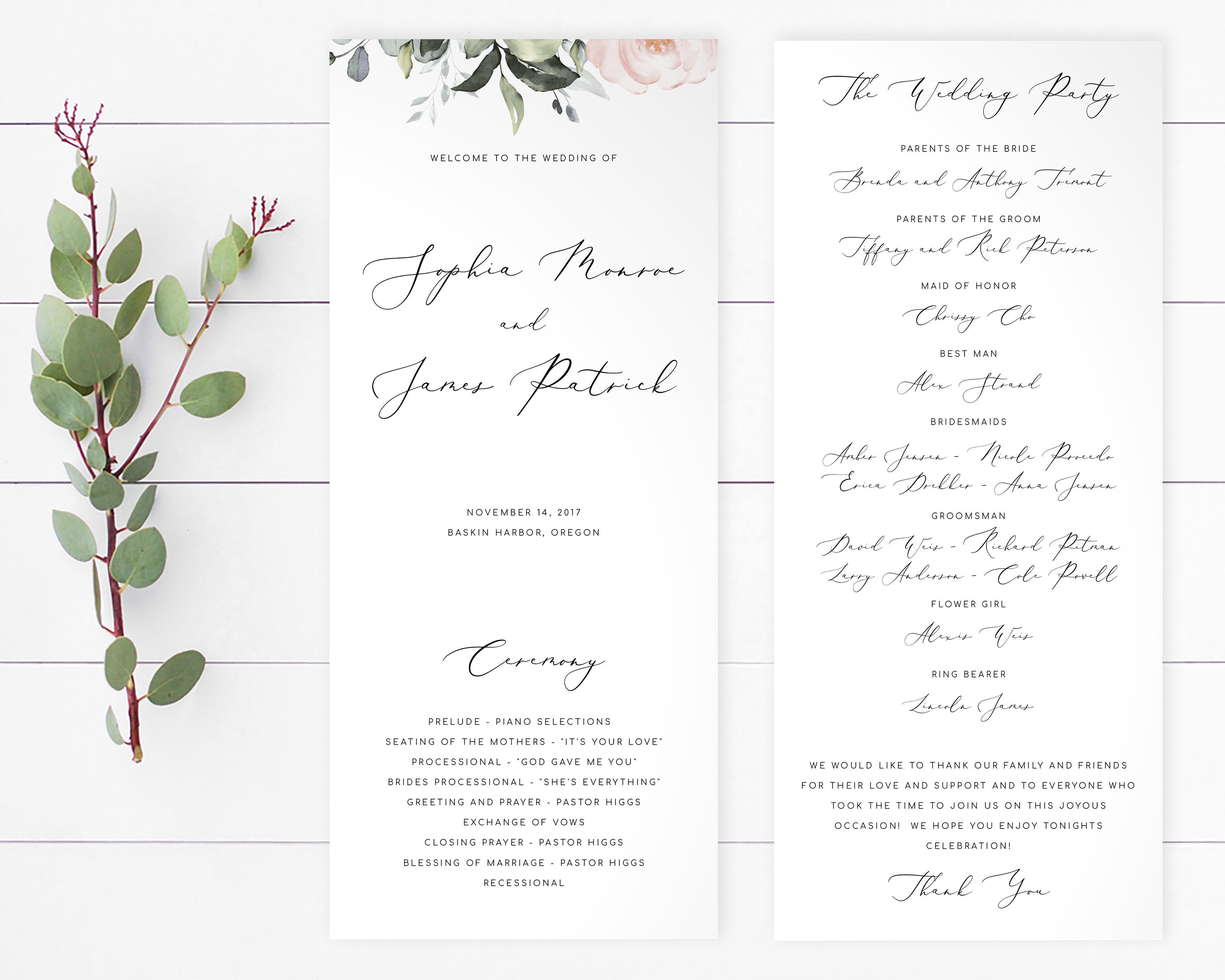 Greenery Tea Length Wedding Program Template Floral Ceremony Program