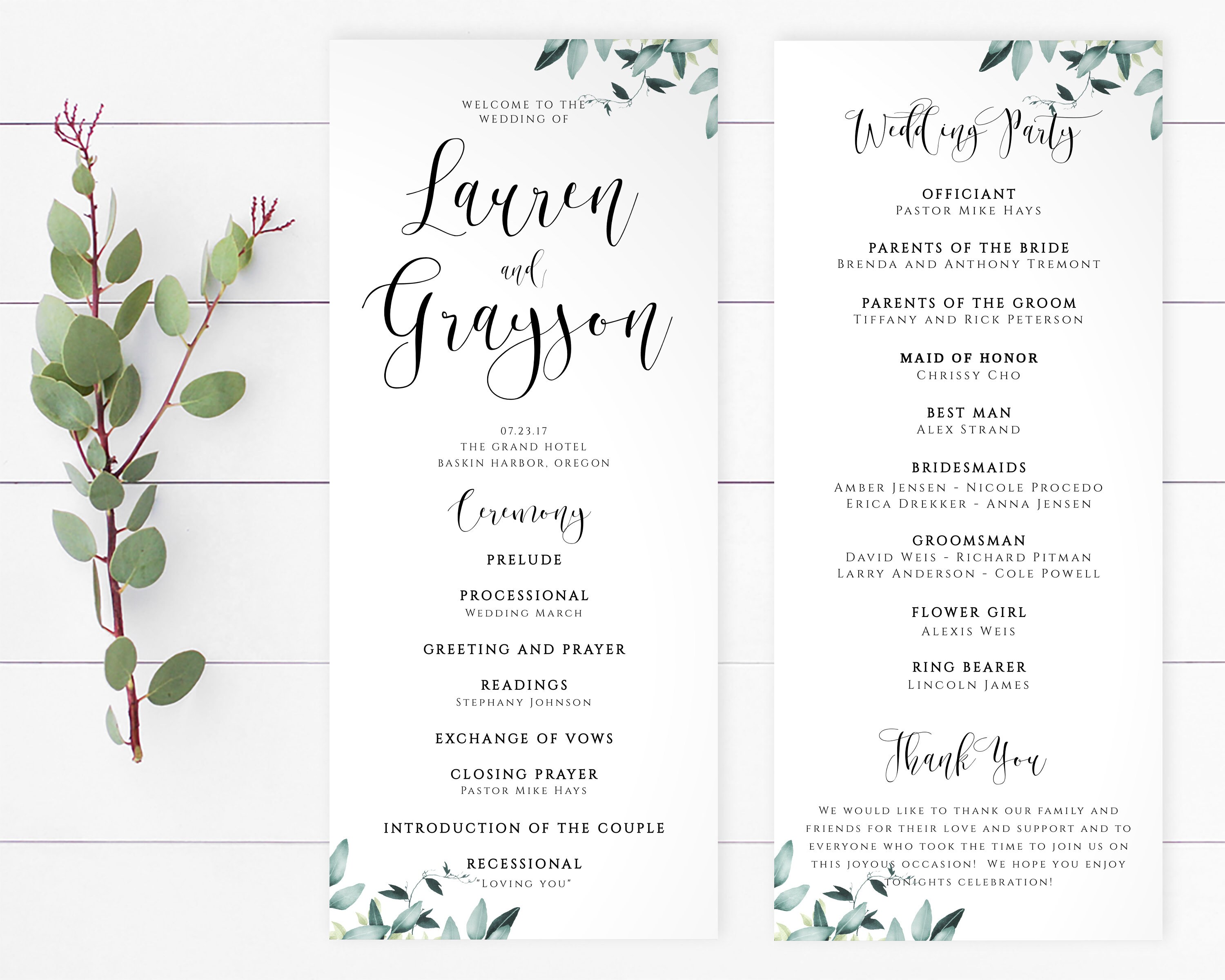 Eucalyptus Tea Length Wedding Program Template Greenery Ceremony