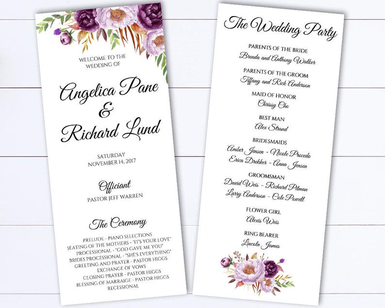 Purple Floral Tea Length Wedding Program Template Floral Etsy