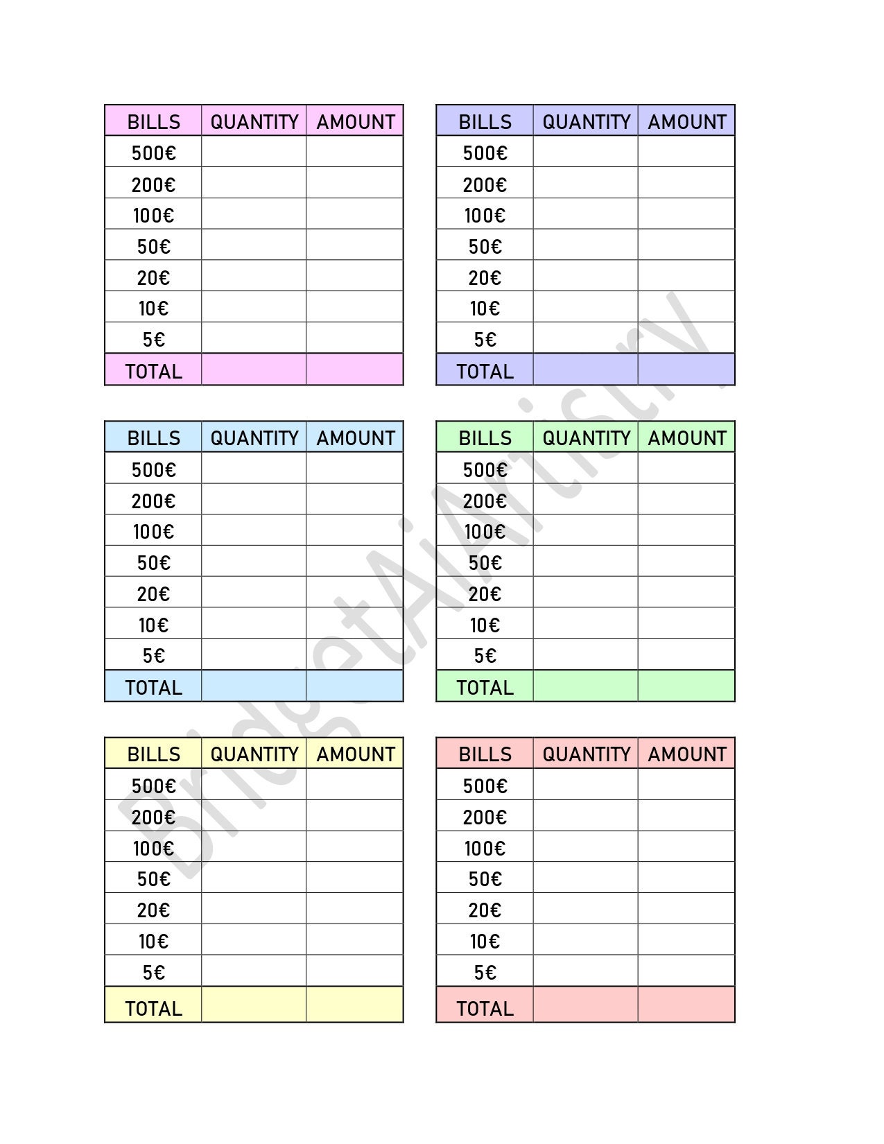 Printable PDF Cash Breakdown Slip Teller Slip for EURO Cash Budgeting