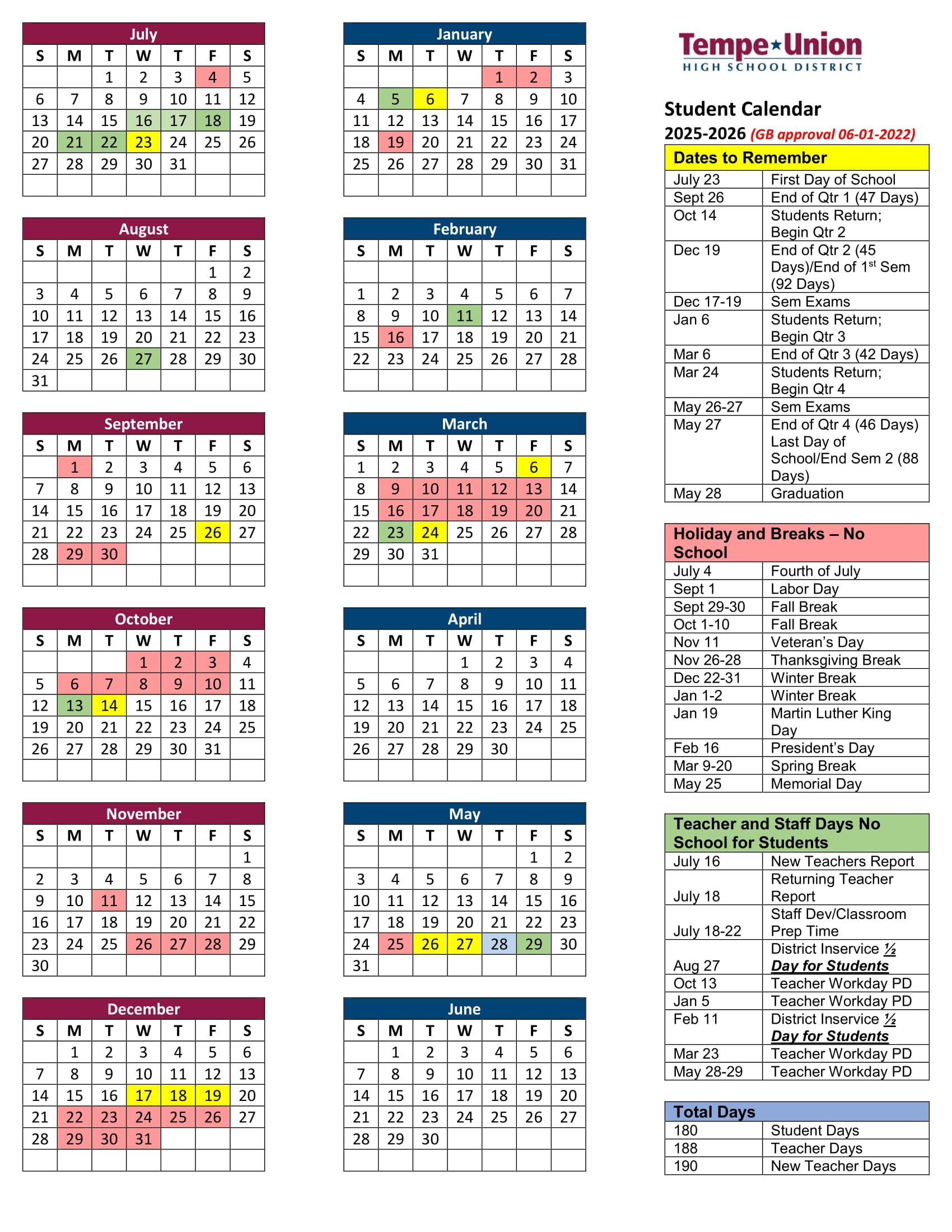 Tempe Union High School District wa Calendar 25 26 Revised PDF