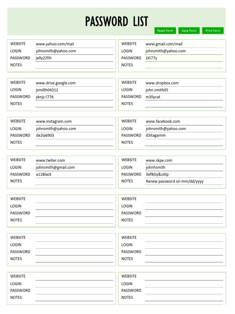 Free Printable Password List Template