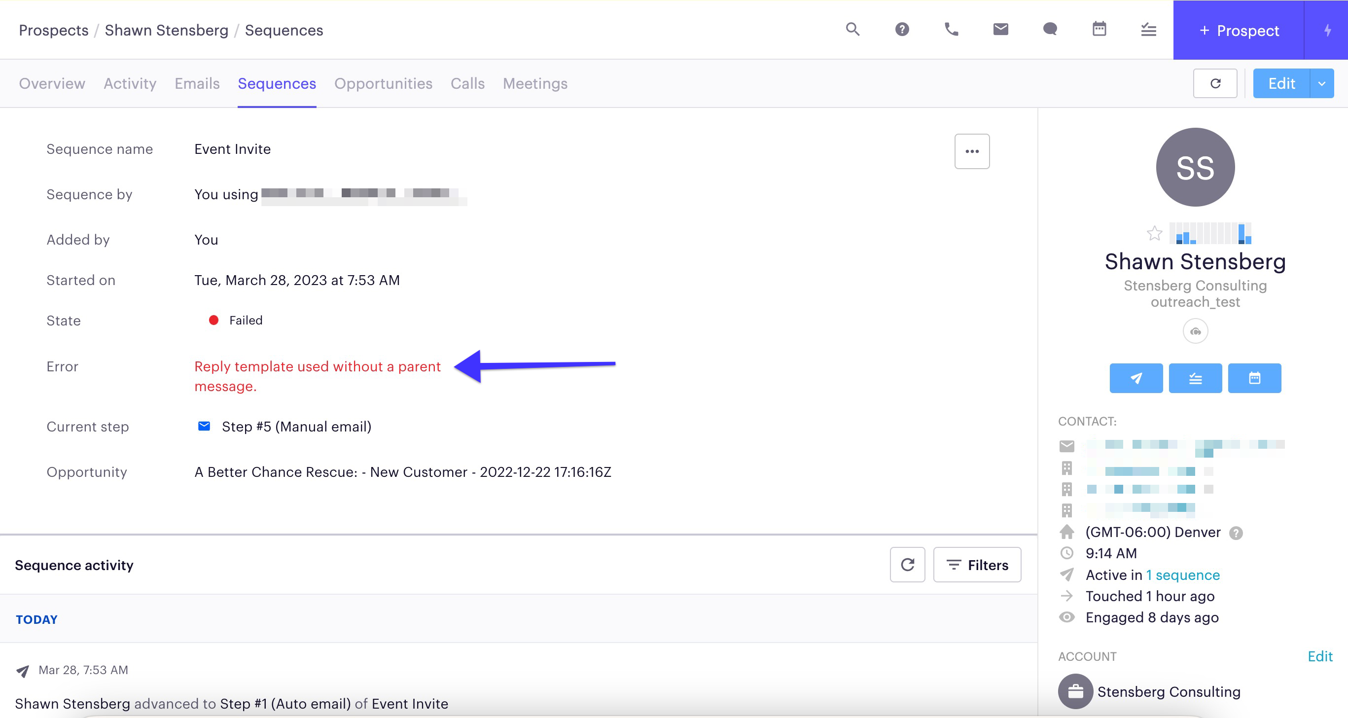 Sequencing Error: Template syntax error or Internal error Outreach