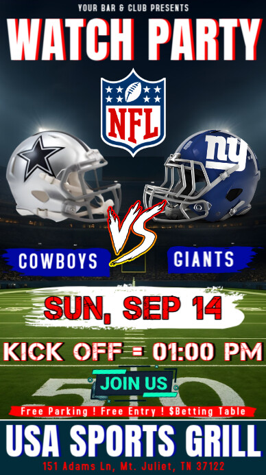 Plantilla de Nfl Regular Season 2025 Cowboys Vs Giants Watch Party