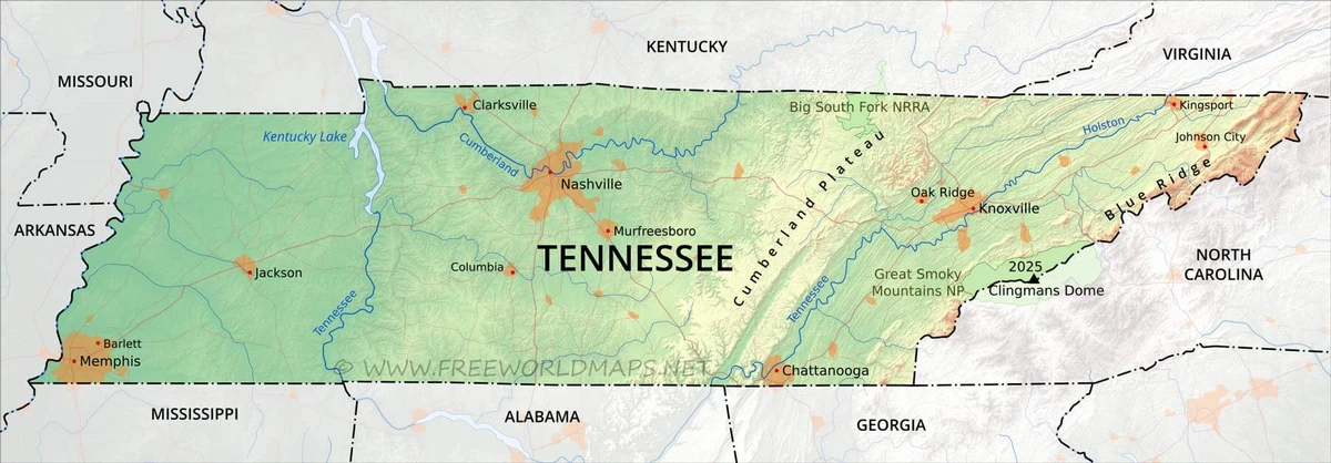 Physical map of Tennessee