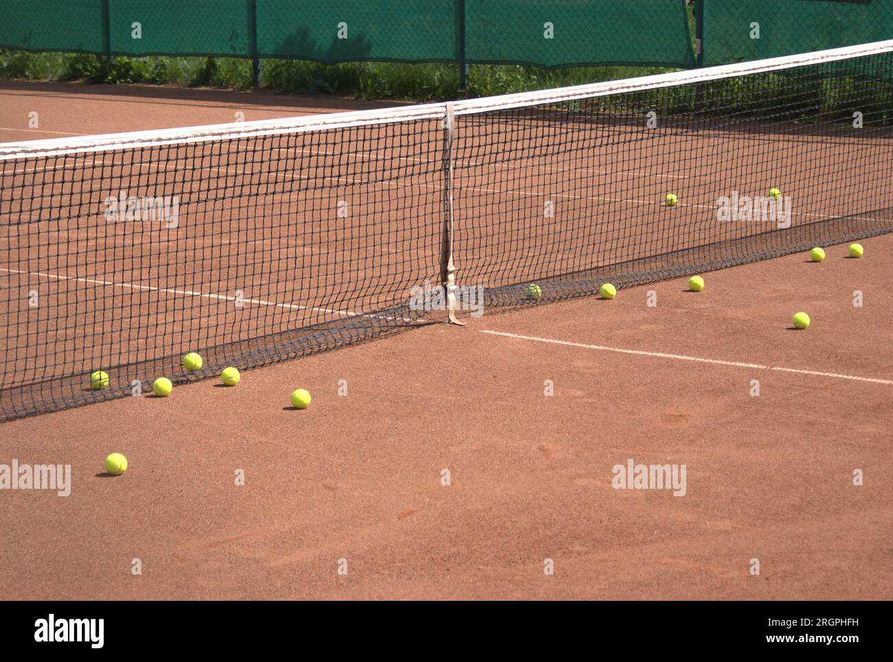Empty tennis clay court and many yellow balls before net Stock Photo