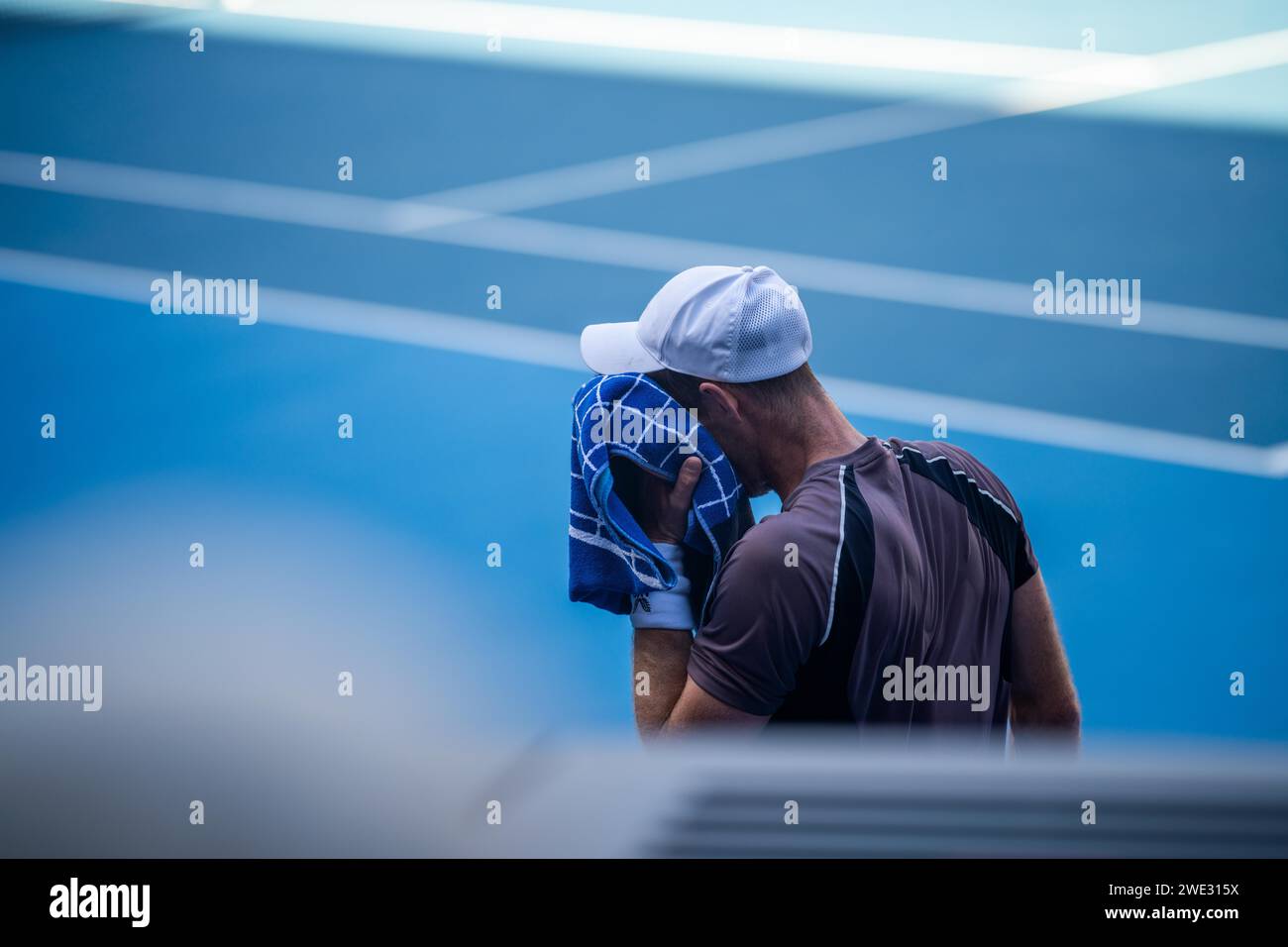 Tennis Player Drying Off with a Towel on a Tennis Court in Summer in