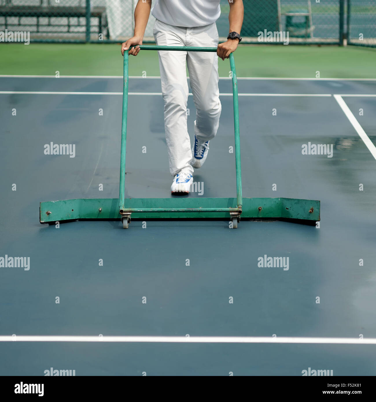 cleaning crew drying tennis court after rain Stock Photo Alamy