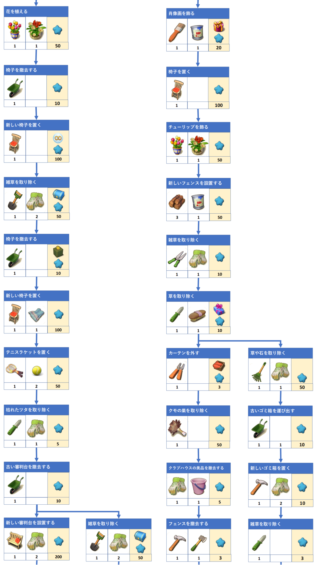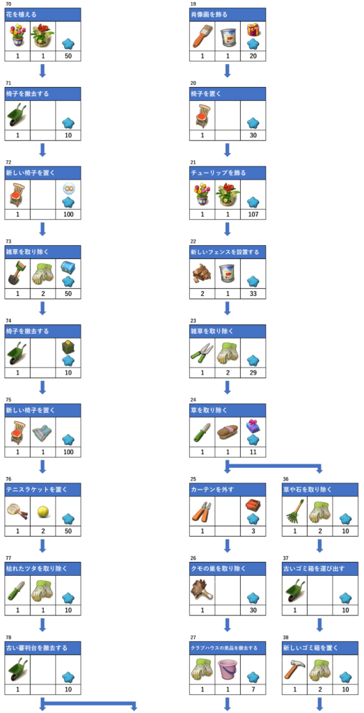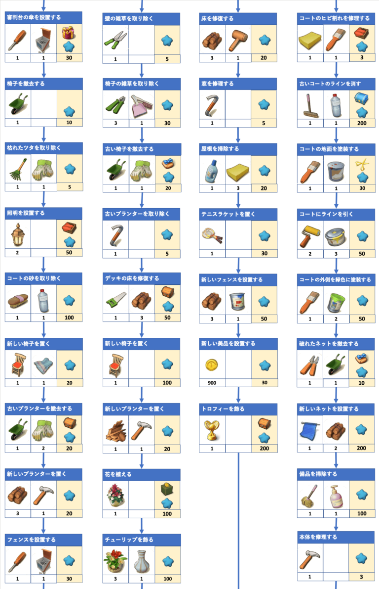 テニスコートのフローチャートとアイテム必要数 マージマンション(Merge Mansion) 攻略サイト