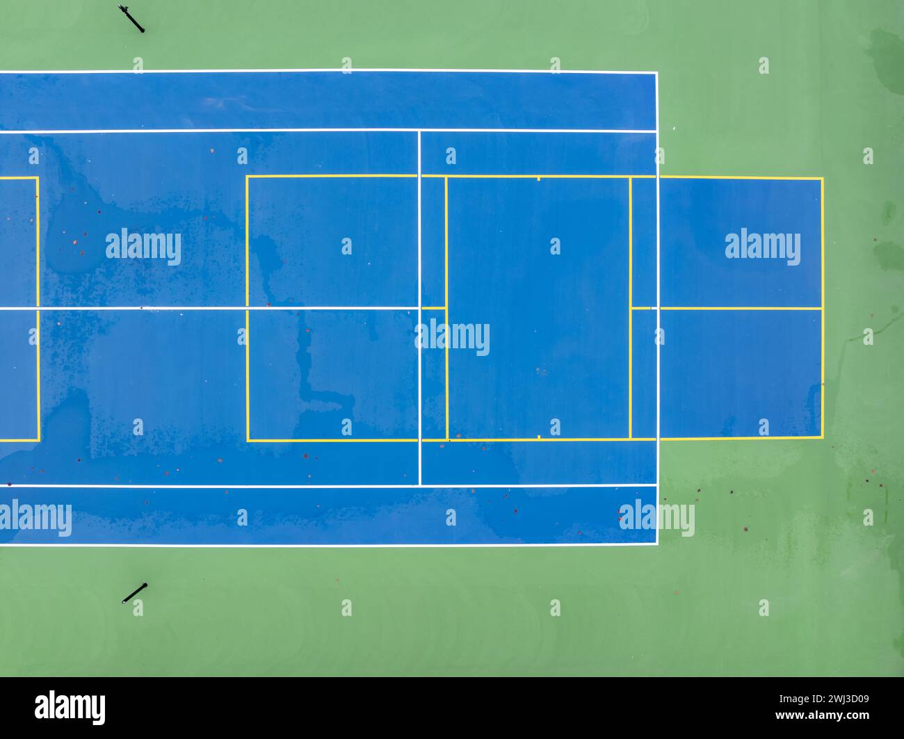 Aerial photo of unusually painted outdoor blue tennis courts with